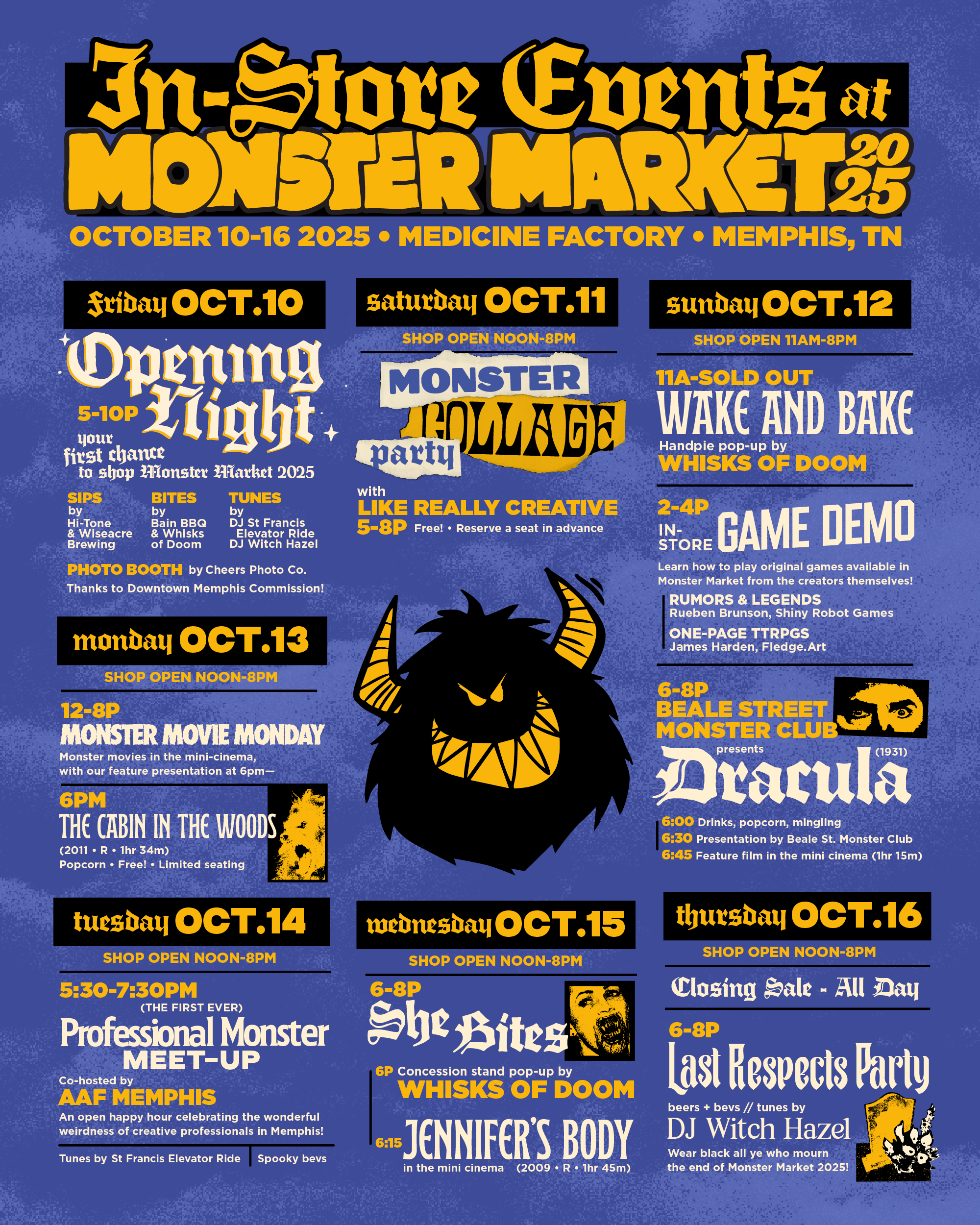 Stop by to shop our crazy selection of maker-sourced spooky wares, art, and novelties any time from October 10-16th— or drop in for any of our free events!